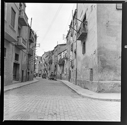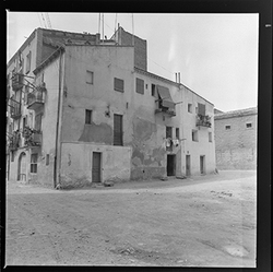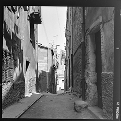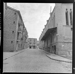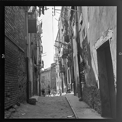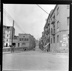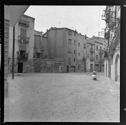 "Vista d’un carrer de la zona alta del Canyeret, amb uns edificis apuntalats amb bigues de ferro; possiblement sigui el Carrer de la Parra"
