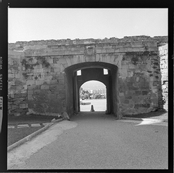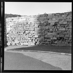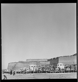 "Vista de la part posterior del Baluard de la Mitja Lluna, de les muralles del Turó de la Seu Vella"