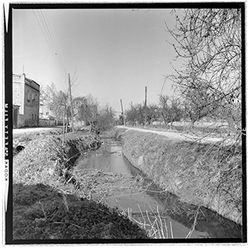 "Vista del recorregut de la Sèquia de Torres al seu pas pel Barri de Cappont. Possiblement es tracta del tram corresponent a l’actual Avinguda d’Alacant, a tocar de l’Avinguda de les Garrigues. La imatge mostra la relació entre aquesta infraestructura hidràulica i l’entorn urbà en transformació."