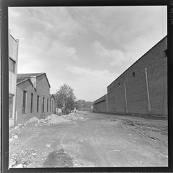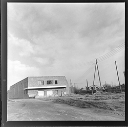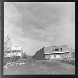 "Vista de l’edifici en construcció ubicat on abans es trobava el Magatzem de RIBÉ - CALPE, situat entre l’Avinguda d’Alacant i el Carrer Camí de Picos. A l’esquerra de la imatge es pot veure parcialment la Sèquia de Torres."