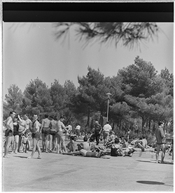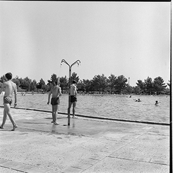 "Parque municipal Alcalde Pons , Les Basses; piscines amb banyistes; al centre, uns homes joves amb es dutxes"