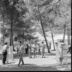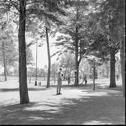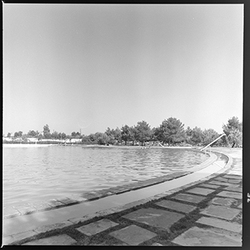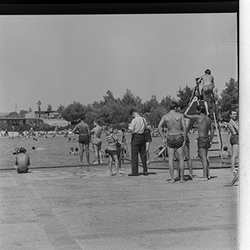 "Parque municipal Alcalde Pons , Les Basses; piscines amb banyistes; al centre, un fotògraf realitza fotografies amb una càmera sobre un trespeus "