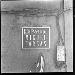 Detall d’una placa amb el nom del carrer: PASAJE MIGUEL FARGAS