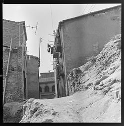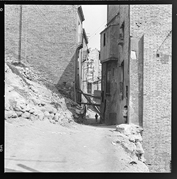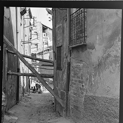 "Vista d’un carrer de la zona alta del Canyeret, amb uns edificis apuntalats amb bigues de ferro"