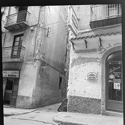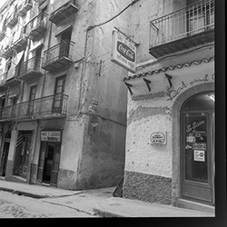 "Vista del carrer Caldereries des del carrer Cavallers; a la dreta es veu el rètol del BAR MI CASA "