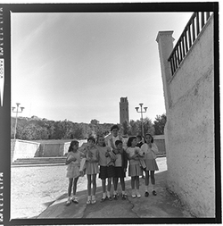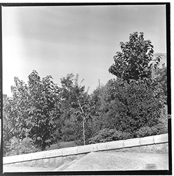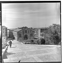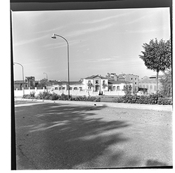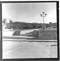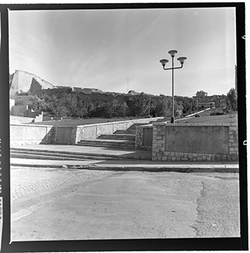 "Escales i jardins d’accés a la Seu Vella; al fons el Mercat del Pla"