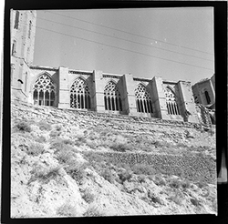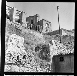 "Vista parcial del claustre i catedral de la Seu Vella des de la part alta del Canyeret"