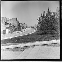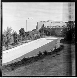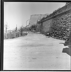 "Camí de circumval·lació en l’accés a la Seu Vella; al fons les muralles"