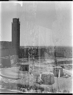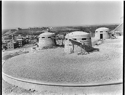 "La Seu Vella des de la Punta del Diamant, a les muralles; en primer terme els dipòsits d’aigua"