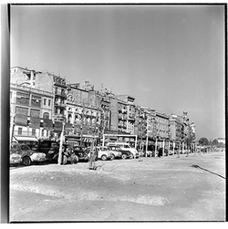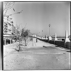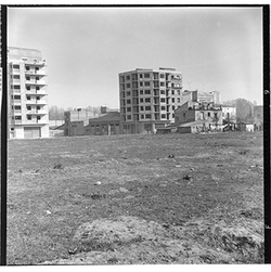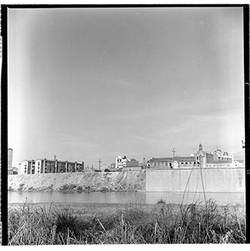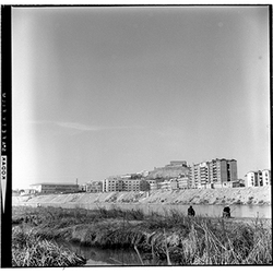 "Avinguda de Madrid; obres d’urbanització i construcció del mur des del marge esquerre del Riu Segre, a l’alçada del Col·legi Montserrat dels Germans Maristes; al fons el castell de Gardeny; 1965"