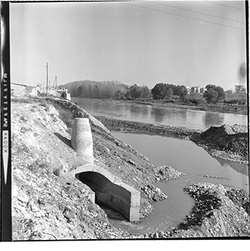 "Marge dret del riu Segre; construcció del mur de contenció; al fons Cappont; 1965"