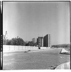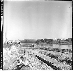 "Avinguda de Madrid; obres d’urbanització i construcció del mur des del marge esquerre del Riu Segre, a l’alçada del Col·legi Montserrat dels Germans Maristes; al fons l’Institut de Batxillerat Màrius Torres; 1965"