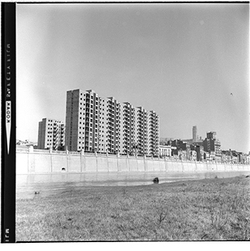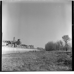 "Marge esquerre del riu Segre; al fons els blocs de l’Estació d’Autobusos, en construcció, i la Seu Vella; 1965"