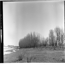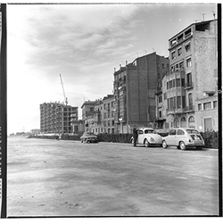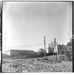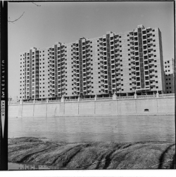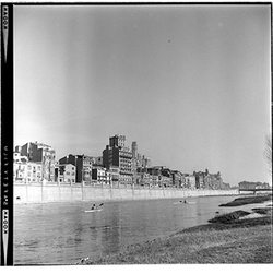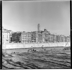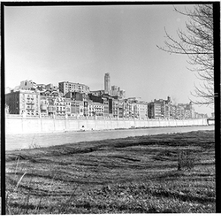 "Marge esquerre del riu Segre; al fons els blocs de l’Estació d’Autobusos, en construcció; 1965"