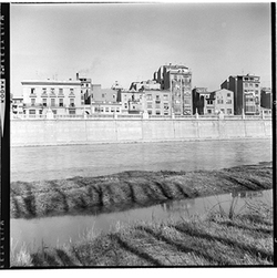 "Marge esquerre del riu Segre; construcció del mur de contenció; al fons l’Avinguda de Blondel amb la Plaça de Sant Francesc; 1965"