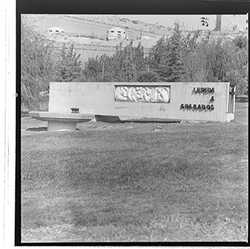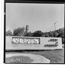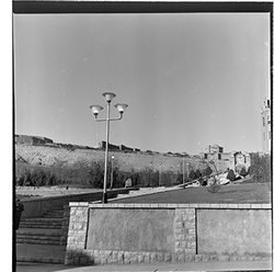 "Jardins d’accés a la Seu Vella; al fons la muralla de la Punta del Diamant"