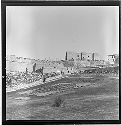 "Jardins d’accés a la Seu Vella; al fons la muralla de la Porta del Lleó"