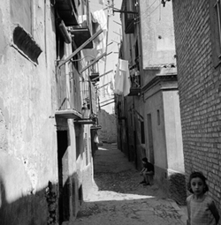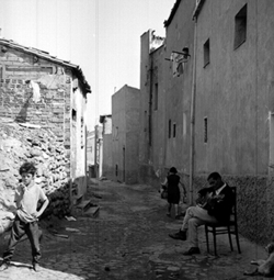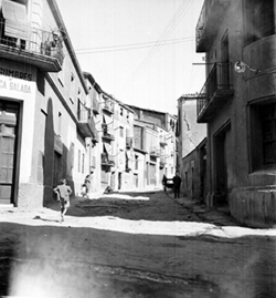 "Part alta del Canyeret; Carrer del Canyeret (?); uns nens i un home toca la guitarra"