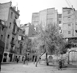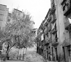 "Ruïnes del Palau dels Marquesos de la Tallada, antic Palau Episcopal; a la dreta, les cases del Carrer de la Cotxera, i al fons la Plaça Cervantes i la Rambla d’Aragó"
