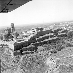 "Vista aèria de la ciutat des del nord-oest; vertical aproximada de l’Avinguda Prat de la Riba (aleshores General Mola); elements destacables en primer terme: Turó de la Seu Vella, amb la catedral, castell de la Suda i conjunt de les muralles"