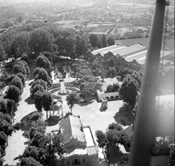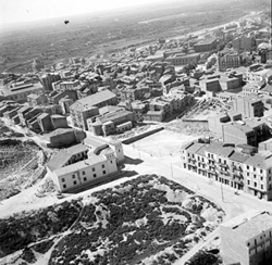 "Vista aèria de la ciutat des del nord-oest; vertical aproximada de l’Avinguda Prat de la Riba (aleshores General Mola); elements destacables en primer terme: Carrer de Sant Martí, Camp de Mart i Caserna de la Policia Nacional"
