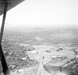 "Vista aèria de la ciutat des del nord; elements destacables en primer terme: zona de camps que correspondrien als actuals barris de Secà de Sant Pere i zona de la carretera d’Osca"