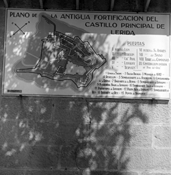 "Plano de Lérida y sus alrededores ; plànol de la ciutat de Lleida i les partides del voltant, penjat a la paret exterior de l’antiga caserna de Cavalleria, al Turó de la Seu Vella"