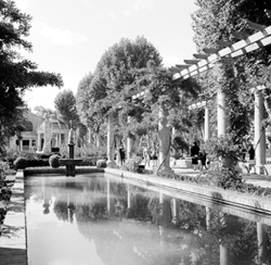 "Camps Elisis; passeig central entre els arbres plataners; al fons el monument construït per l’organisme “Regiones Devastadas” al final del passeig"