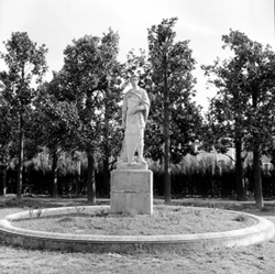"Camps Elisis; jardins; al fons es veu el solar annex al l’edifici de l’antic teatre, Pavellón Frutero de la Fira de Sant Miquel i actual Pavelló Poliesportiu Antorxa, on es construirà la piscina coberta"