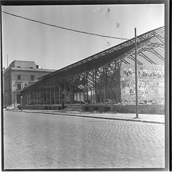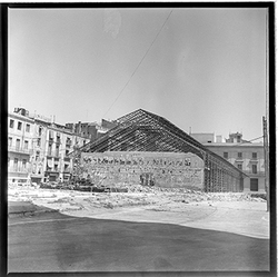 "Enderrocament de l’estructura metàl·lica del Mercat de Sant Lluís. \nAl costat esquerra es veu la Casa de la Lira o casa Morera."