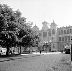 "Antic mercat de la Magdalena i Carrer de la Parra, al costat del vessant del Turó de la Seu Vella; es veuen diversos quioscos de venda de begudes"