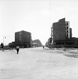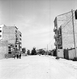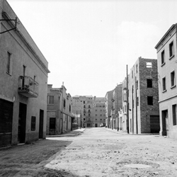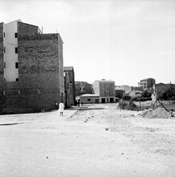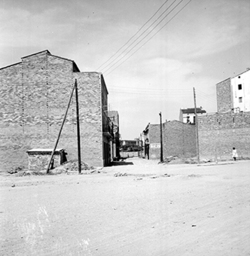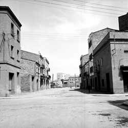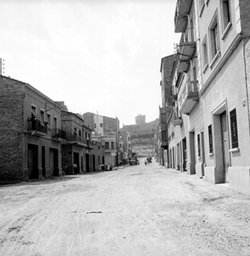 "Carrer Príncep de Viana; al fons hi hauria l’actual Plaça d’Europa i el xamfrà amb l’Avinguda Alcalde Porqueres, antiga carretera nacional núm. 230, i els Blocs Germans Recasens, ja a Balàfia"