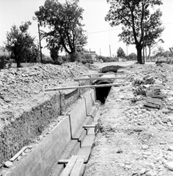 "Carrer Príncep de Viana, obres d’urbanització i construcció de clavegueram; possiblement es tracta de la canalització i soterrament del riu Noguerola, en un lloc proper a la Plaça del Treball"