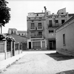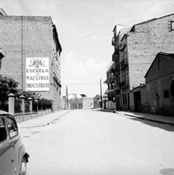 "Carrer Pi i Margall (antic Calvo Sotelo); al fons a l’esquerra hi ha edifici de l'Escola del Treball; més a prop, inici del Carrer de la Premsa. ESCUELA DE MAESTRIA INDUSTRIAL"