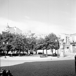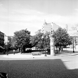 "Antic mercat de la Magdalena, des de la Plaça Mossèn Jacint Verdaguer i del Carrer Pi i Margall (antic Calvo Sotelo), al costat del vessant del Turó de la Seu Vella; es veuen diversos quioscos de venda de begudes; en primer terme un pirulí informatiu"