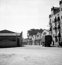 "Carrer Príncep de Viana des de la cruïlla del carrer Sant Ruf. A la dreta es veu una part de la Barberia del Sr. Miñano. Al fons es veu la plaça Ramon Berenguer IV."