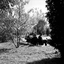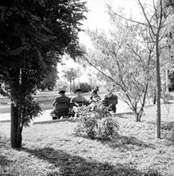 "Jardins de la Plaça de la Pau, annexa a l’edifici del Govern Civil; vista des de l'Avinguda de Francesc Macià; uns homes d’edat avançada prenen el sol asseguts en un banc"