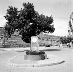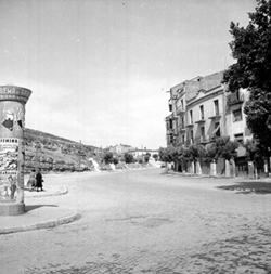 "Plaça Mossèn Jacint Verdaguer, amb el monument a l’escriptor; al fons a la dreta, comença el Carrer Salmeron, i es veu el Turó de la Seu Vella; en primer terme a la dreta comença el Carrer Pi i Margall"