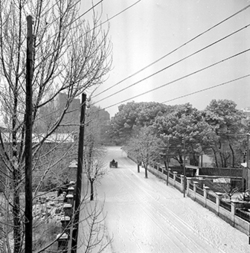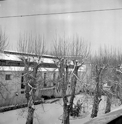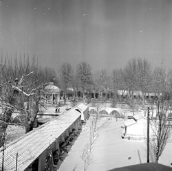"Pavelló Antorxa dels Camps Elisis amb una gran nevada; al fons es veu el Quiosc de la Música i el passeig central coberts per la neu; vista des del domicili particular de Lluís Terrés Pàmpols al Carrer de Santa Cecília; barri de Cappont"
