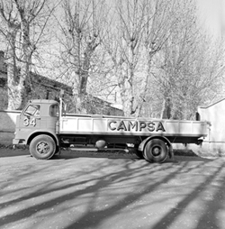 "Eduardo Velasco; concessionari oficial de vehicles Mercedes; camió de transport de carburants, de C.A.M.P.S.A., aparcat al Carrer de Santa Cecília; a l’esquerra, els Camp Elisis; barri de Cappont"