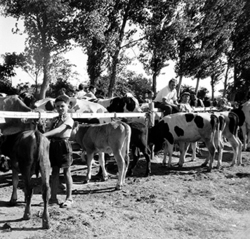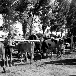 "Antic Firal de Bestiar situat al barri de Pardinyes, entre l’actual Avinguda de Tortosa i el Riu Segre; detall dels tancats de bestiar, amb vaques i vedells, i diverses persones observant"