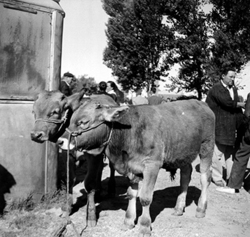 "Antic Firal de Bestiar situat al barri de Pardinyes, entre l’actual Avinguda de Tortosa i el Riu Segre; detall dels tancats de bestiar, amb vaques i vedells, i diverses persones observant"