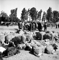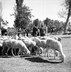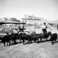 "Antic Firal de Bestiar situat al barri de Pardinyes, entre l’actual Avinguda de Tortosa i el Riu Segre; detall dels tancats de bestiar, amb vaques i vedells i ovelles, i diverses persones observant"