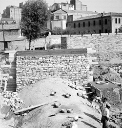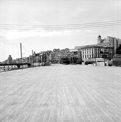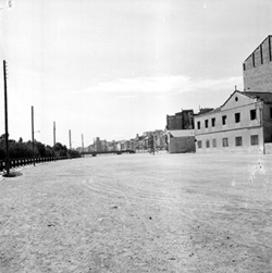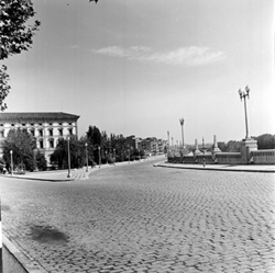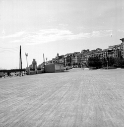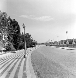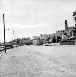 "Avinguda del Segre; a l’esquerra comencen els jardins de la Plaça de la Pau, annexa a l’edifici del Govern Civil; a la dreta, el mur sobre el riu"