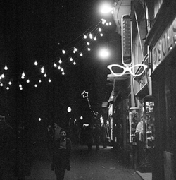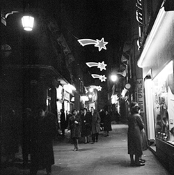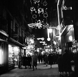 "Carrer Major; vista nocturna amb il·luminació nadalenca; a la dreta es veu la botiga Bellostas Vidal"
