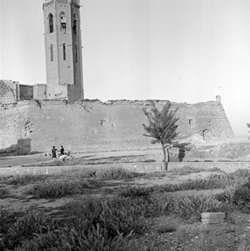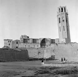 "Vista de la façana del claustre i el peu del campanar; la zona apareix en diverses obres de neteja; al fons hi ha el rètol DIRECCIONES GENERALES DE BELLAS ARTES Y ARQUITECTURA ORDENACION CIUDADES INTERES ARTISTICO RESTAURACION CATEDRAL"