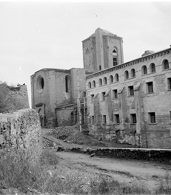 "Obres de reconstrucció de la Canònica, o Casa d'Exercicis; vista des de la pujada a la Suda"