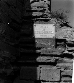 "Part del darrera de la Porta del Lleó, de les muralles de la Seu Vella; placa amb l’antiga Plaza de Hispanoamérica"