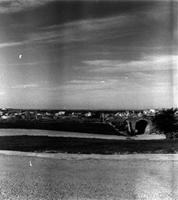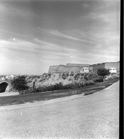 "Part del darrera de la Porta del Lleó, de les muralles de la Seu Vella; dipòsits d’aigua i muralla de la Punta del Diamant al fons"