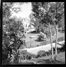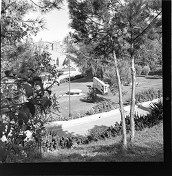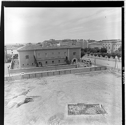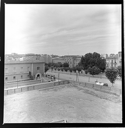 "El Palau del Bisbe, la Rambla d’Aragó, amb l’edifici del Seminari i al fons el turó de Gardeny; en primer terme, l’espai del desaparegut Palau del Bisbe, annex al carrer de la Tallada"